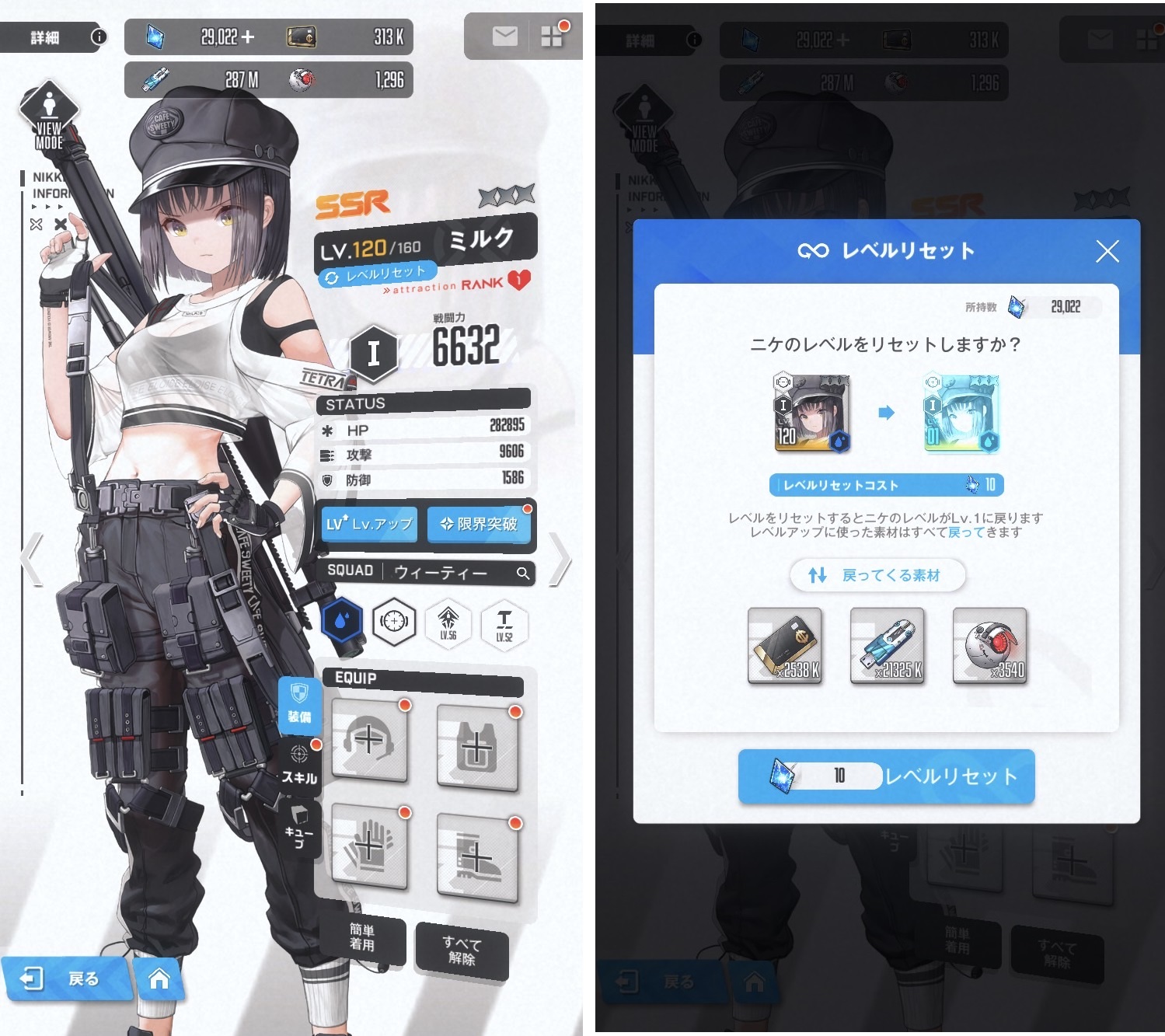 今回、たまたま無凸のままで好感度も全く上げていない「ミルク(火力型・SR)」がいたので、彼女を対象に考察してみました。素材を使ってレベル1から順に120レベルまで、無凸から1凸したときに攻撃力がいくつ上がるのか?を検証してみます。
