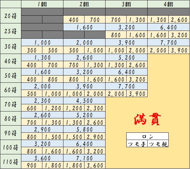 麻雀の点数にはある程度法則性があり、”満貫までは翻数が1増えると約2倍に、符数が1増えると翻数×400点程度上がります。(親なら1符につき600点×翻数)”
